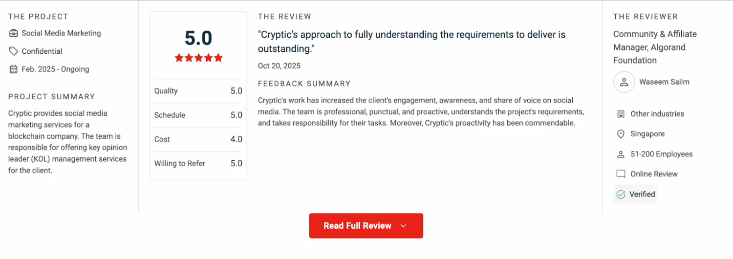 - Testimonials from Crypto Clients: Cryptic has increased the client’s engagement and awareness on social media platforms. The team proved to be professional, punctual, and proactive, understands the project’s requirements, and takes responsibility for their tasks.