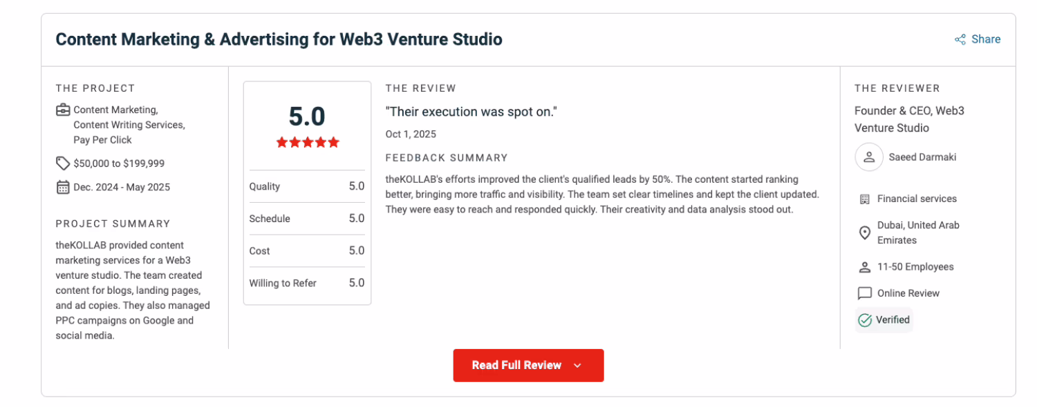 Notable campaign: As one of the best Google Ads agencies, theKOLLAB helped a Web3 venture studio increase qualified leads by 50% by combining content marketing with paid advertising. The team created SEO-focused blogs, landing pages, and ad copy while managing PPC campaigns across Google and social media. This integrated approach improved search rankings, drove consistent traffic, and delivered stronger conversion rates. Their ability to combine creative content with data-driven optimization made them a reliable partner for Web3 projects looking to scale lead generation through multiple channels.